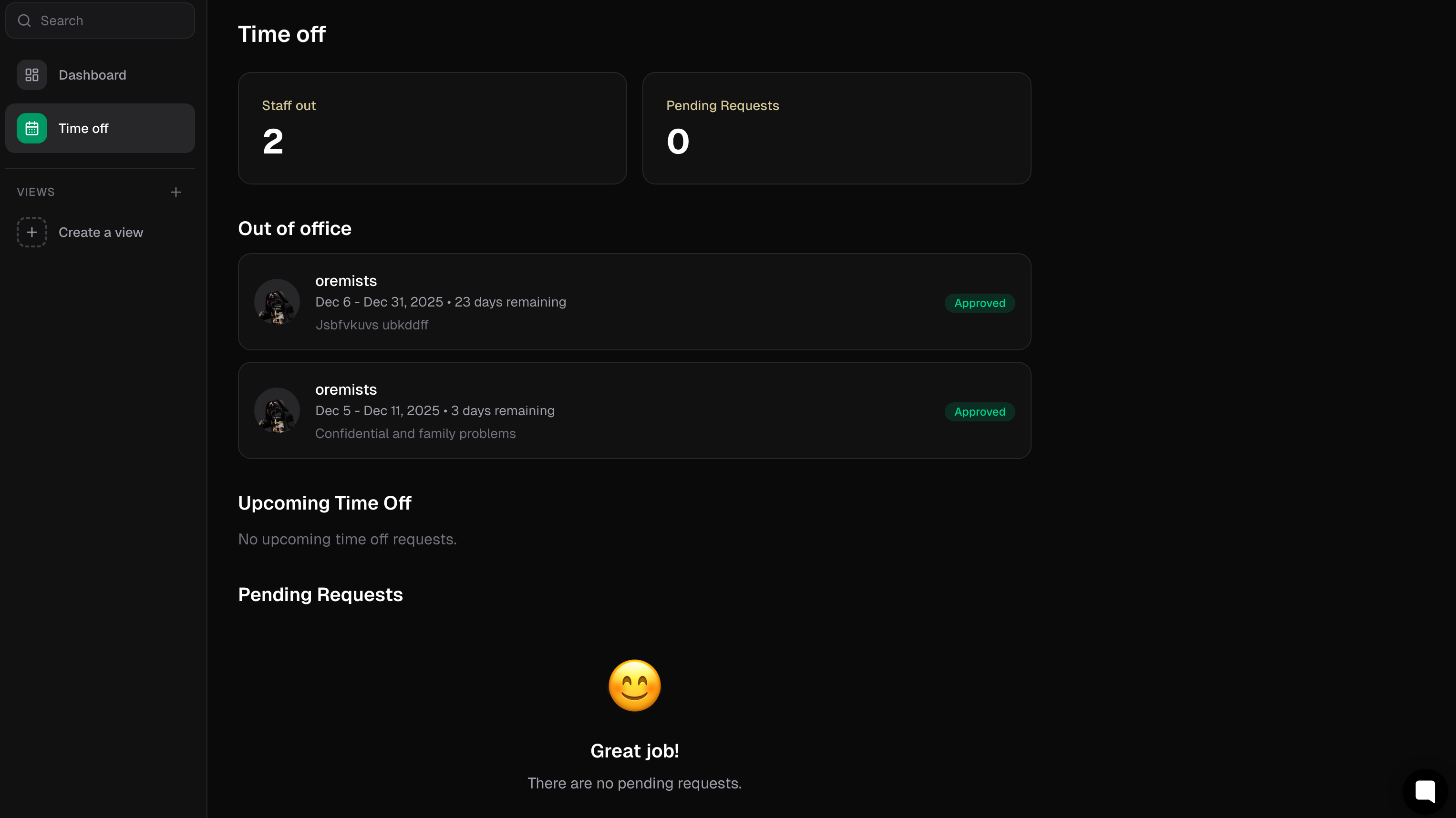 Another part of Staff Management is Time Off where all your department members are able to see the pending requests, approve/deny them and who’s currently on an IN (Inactivity Notice).